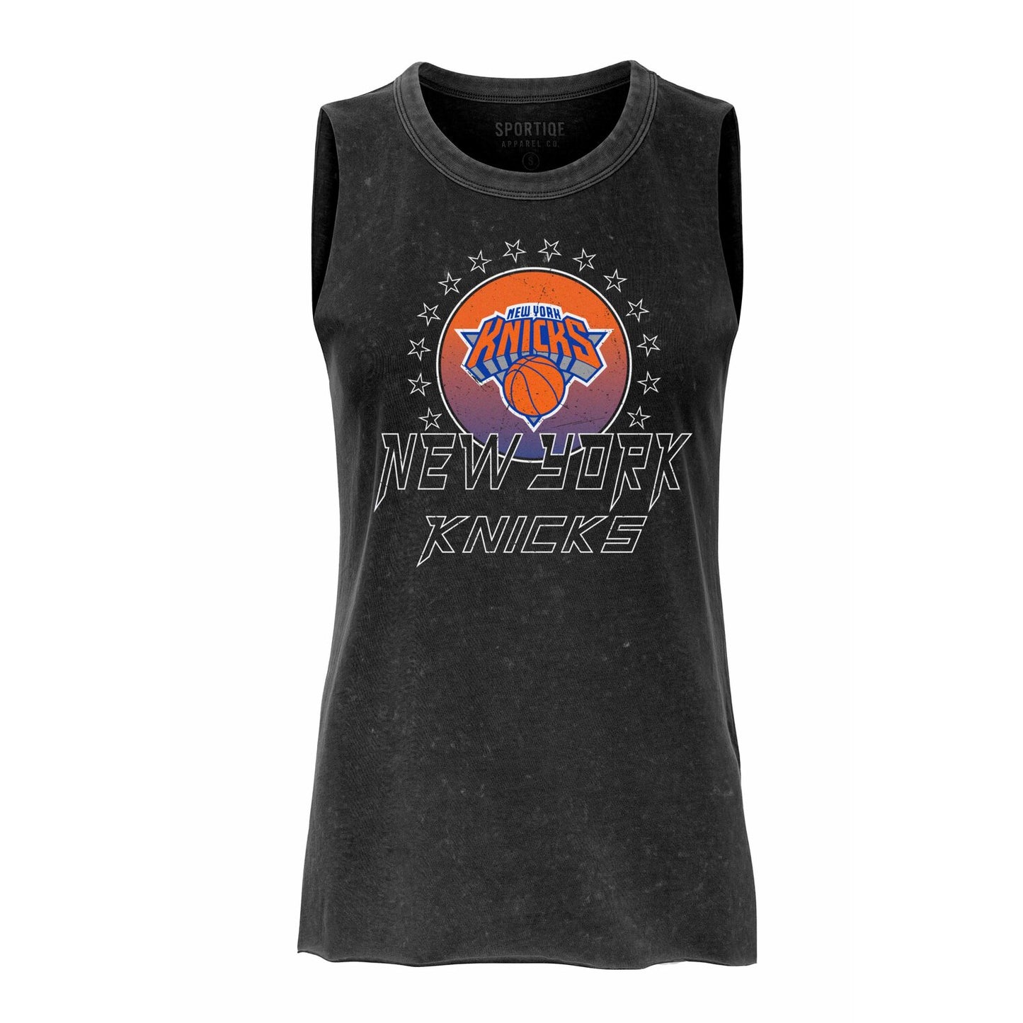 The Women's Sportiqe Turner Styx Tank Top blends retro concert vibes with Knicks pride. Featuring a bold, distressed Knicks graphic on a black acid-wash backdrop, this sleeveless style is perfect for warm-weather fandom or layering with edge.