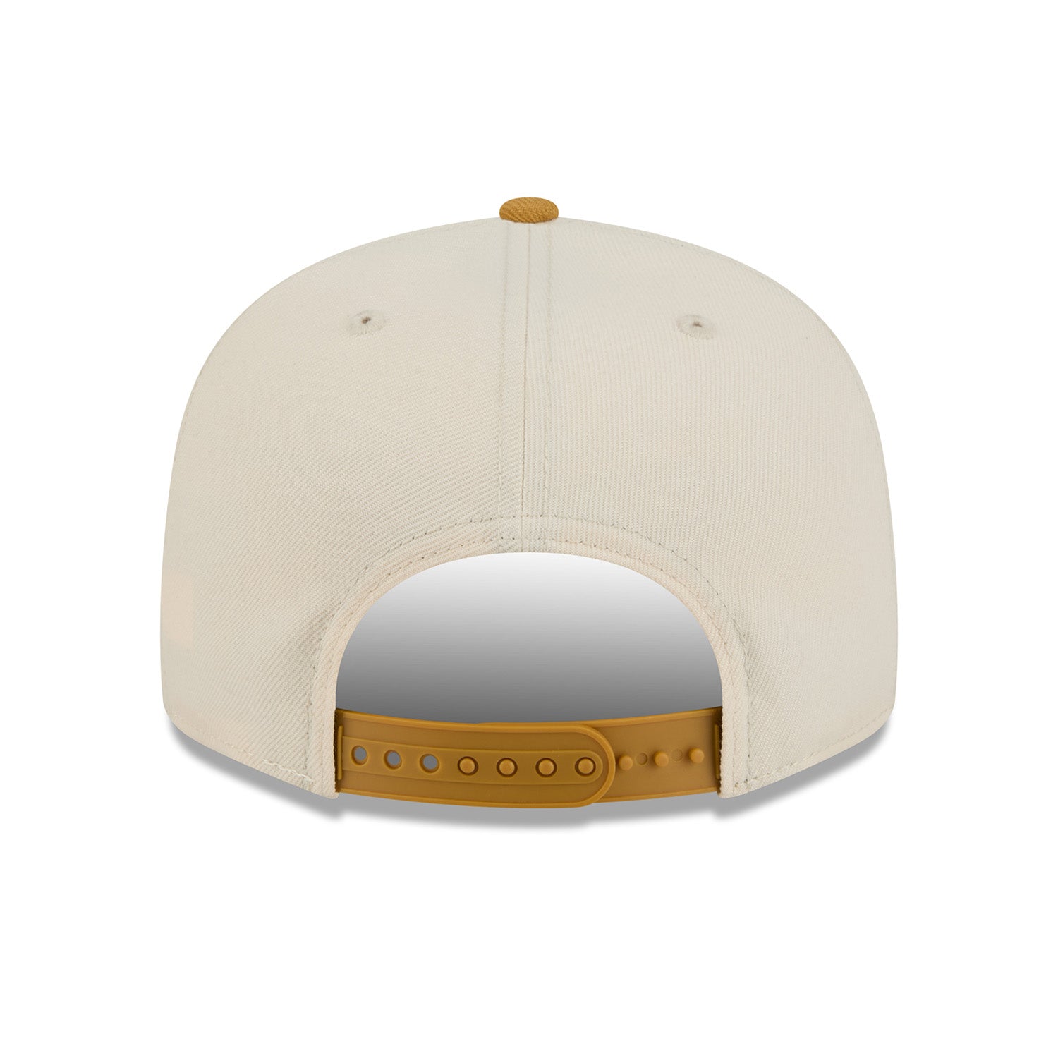 The New Era Knicks Two Tone Light Cream/Tan Colorpack 9FIFTY Snapback features a clean light cream crown paired with a contrasting tan brim for a refined, neutral look. Built on the structured 9FIFTY silhouette with a flat visor and adjustable snapback closure, it provides a secure, customizable fit. Finished with bold Knicks embroidery, this cap delivers effortless style for game day and beyond.