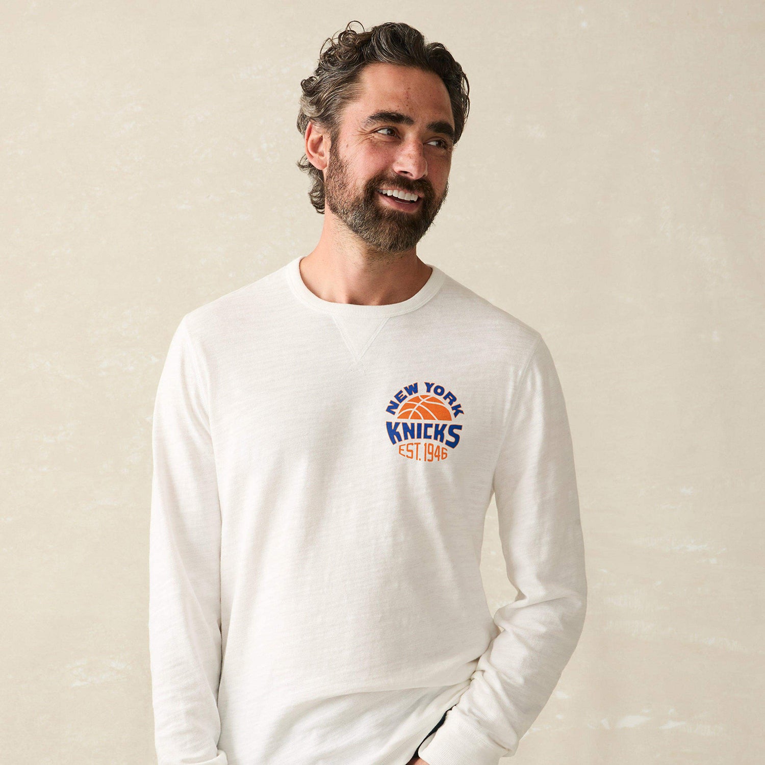 The Faherty Knicks White Sunwashed Slub Crew offers soft, everyday comfort with timeless, team-inspired style. Crafted from sunwashed slub fabric for a relaxed, textured feel, it’s perfect for casual wear or cheering on the Knicks. Subtle Knicks detailing completes the clean, streetwear-ready look.