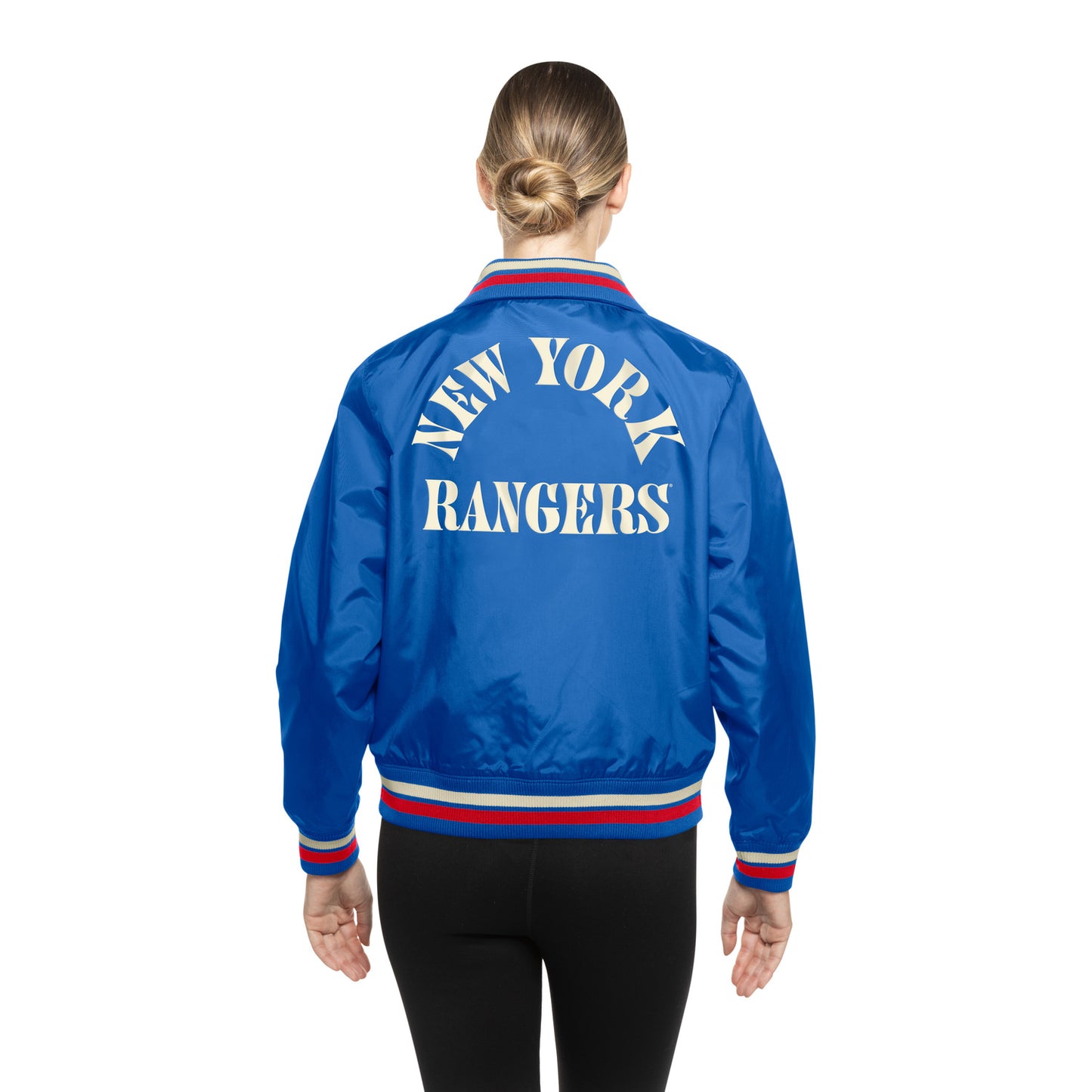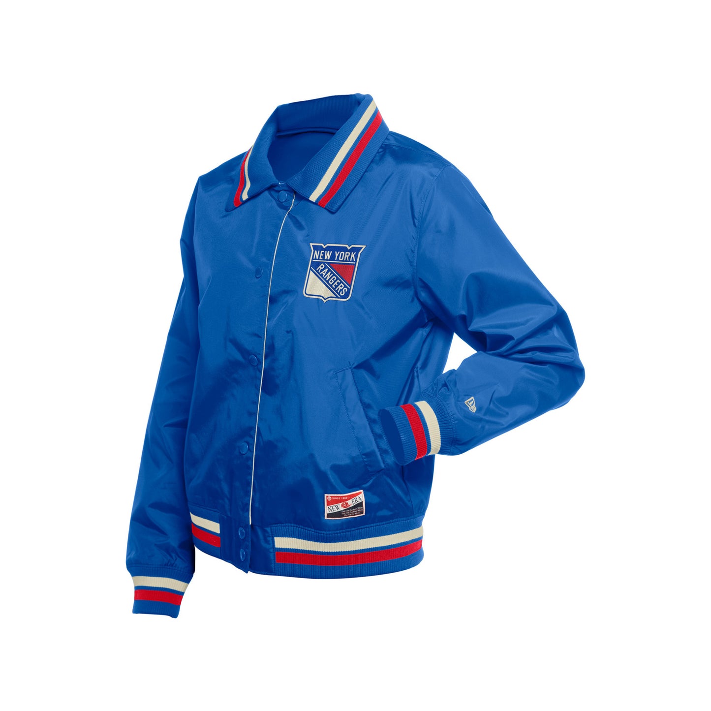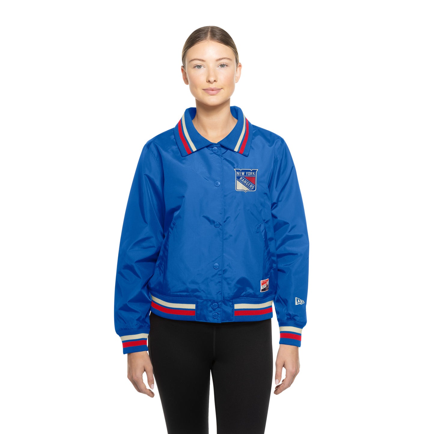 Step up your game-day look with the Women's New Era Rangers Throwback Nylon Jacket. Designed with a lightweight yet durable nylon shell, this retro-inspired jacket features bold Rangers colors, a classic team logo, and striped ribbed trim for a vintage touch. Perfect for chilly nights at the rink or everyday wear, it’s a stylish must-have for any devoted Rangers fan.
