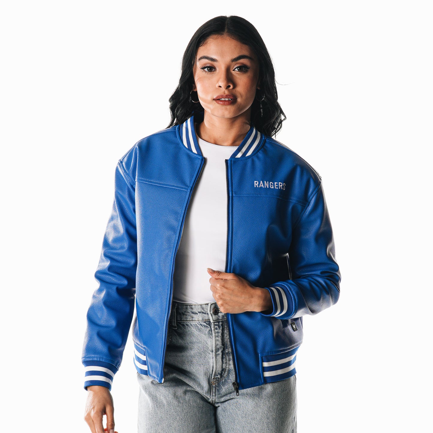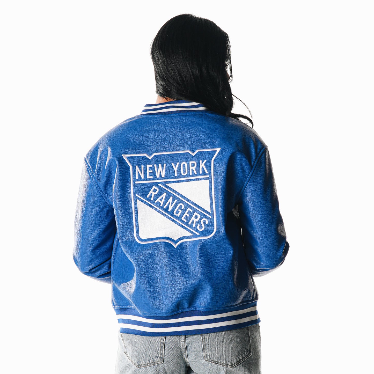 The Wild Collective Rangers Royal Faux Leather Bomber Jacket is a bold and stylish piece for New York Rangers fans. Made from high-quality faux leather, this jacket features a classic bomber silhouette with a zip-up front, striped ribbed cuffs, and hem. The minimal "RANGERS" embroidery on the chest adds a sleek and modern touch, making it perfect for game days or casual streetwear.
