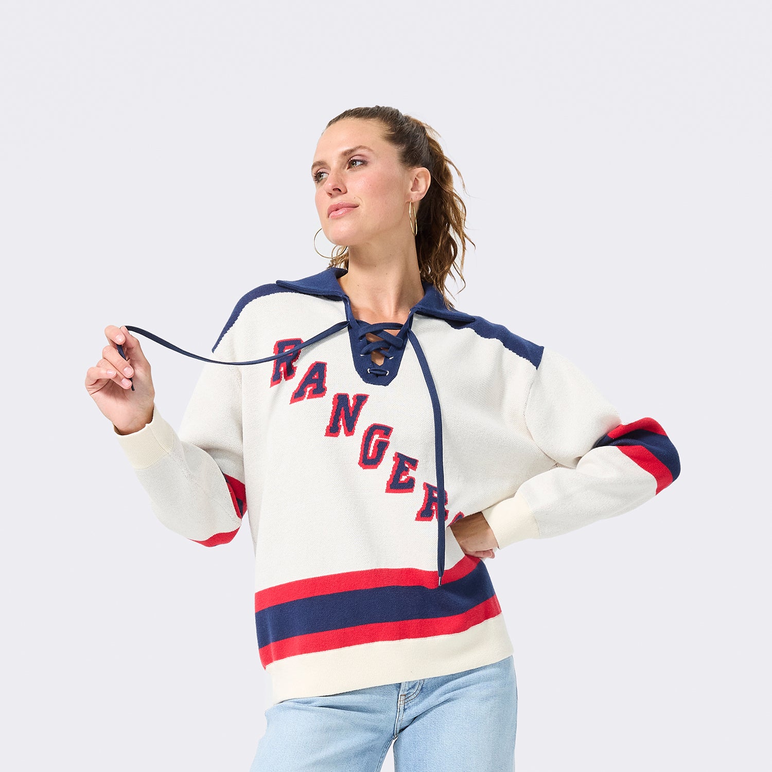 Show off your Rangers pride in the Terez Rangers Hockey Lace Knit Cotton Sweater. Crafted from soft, breathable cotton, this sweater features a hockey-inspired lace detail and bold team graphics for a sporty, stylish look. Perfect for game days or layering into your everyday wardrobe.