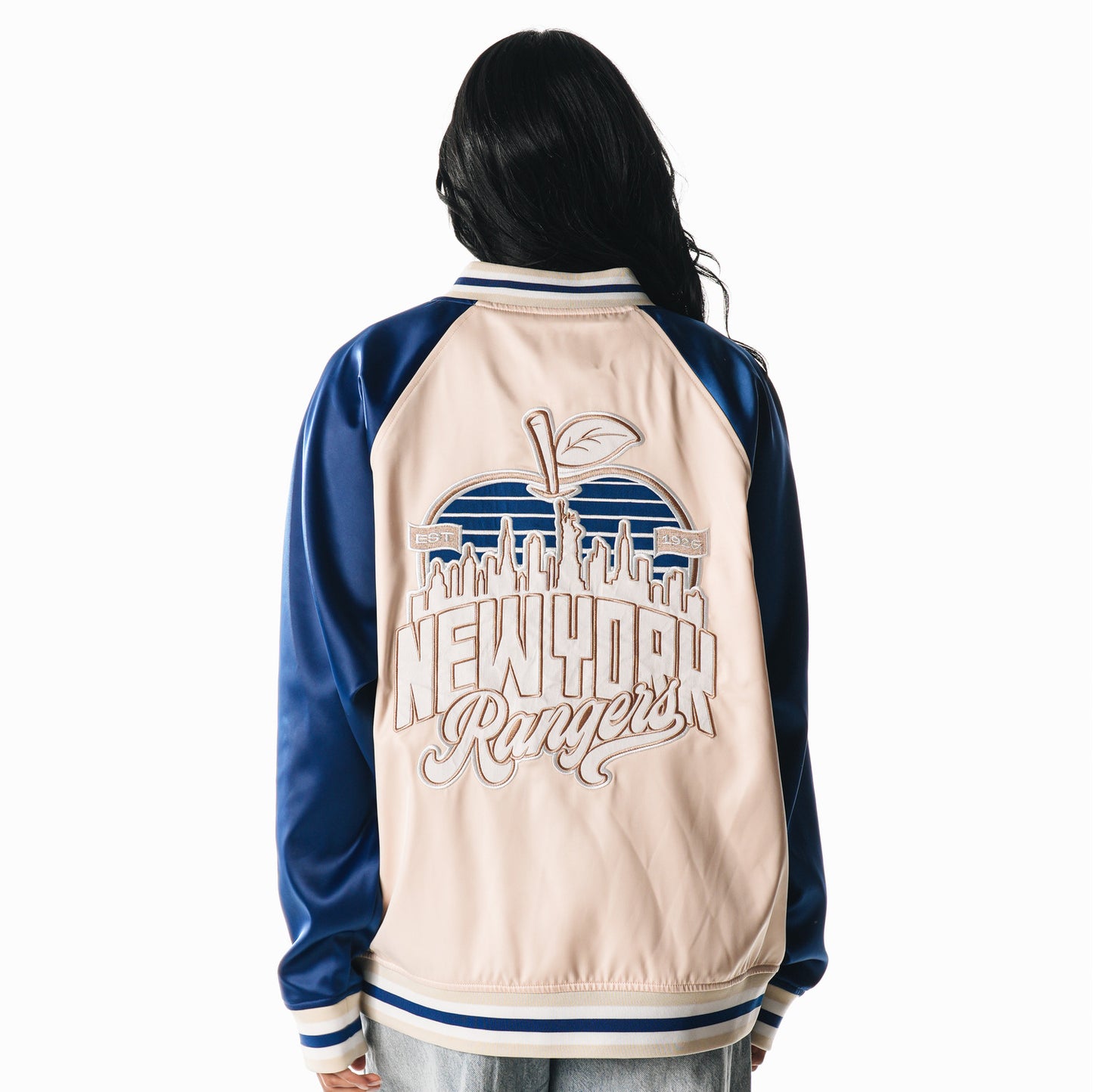 The Wild Collective Rangers Raglan Satin Track Jacket blends classic sports style with luxurious satin fabric, making it a must-have for New York Rangers fans! Featuring a cream body with bold blue raglan sleeves, this jacket has a snap-button front, striped ribbed cuffs, and hem for a retro-inspired look. Finished with an embroidered Rangers logo on the chest, this stylish and comfortable piece is perfect for game days or everyday wear!