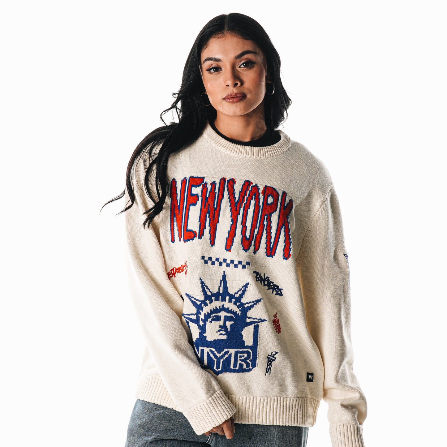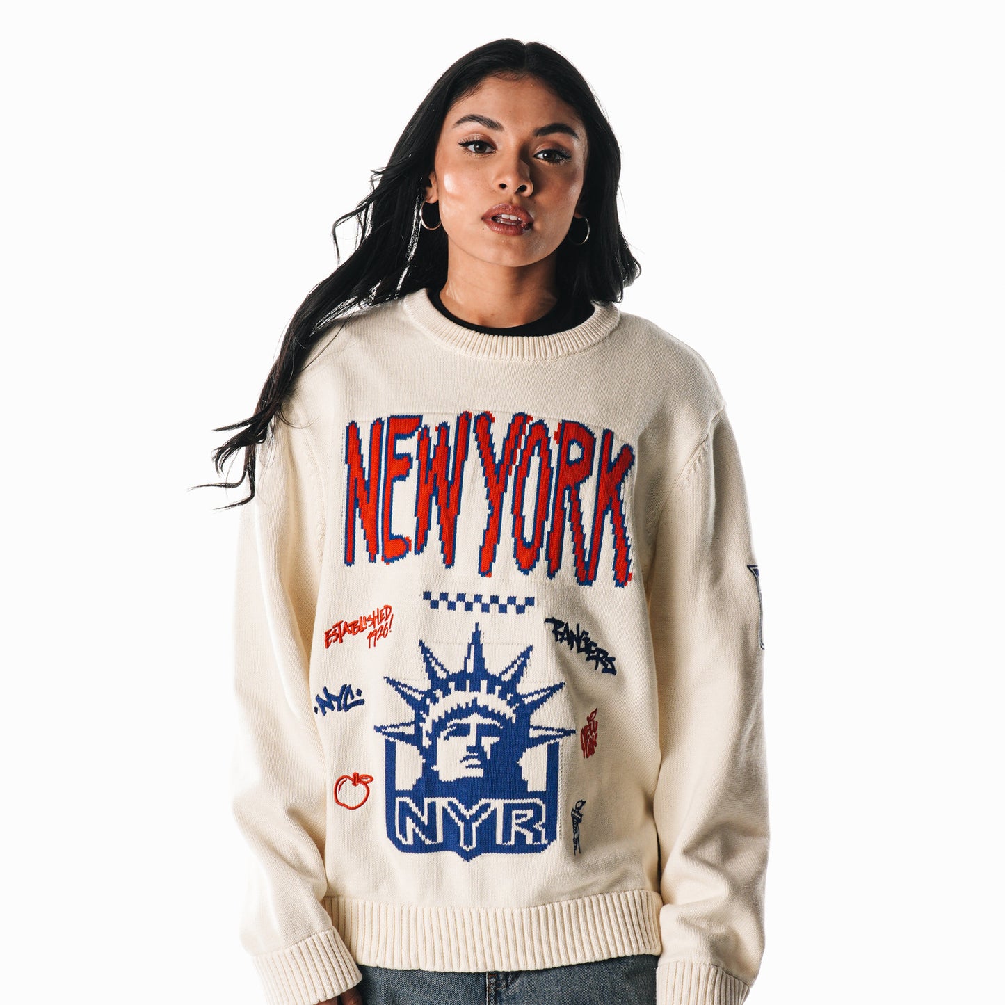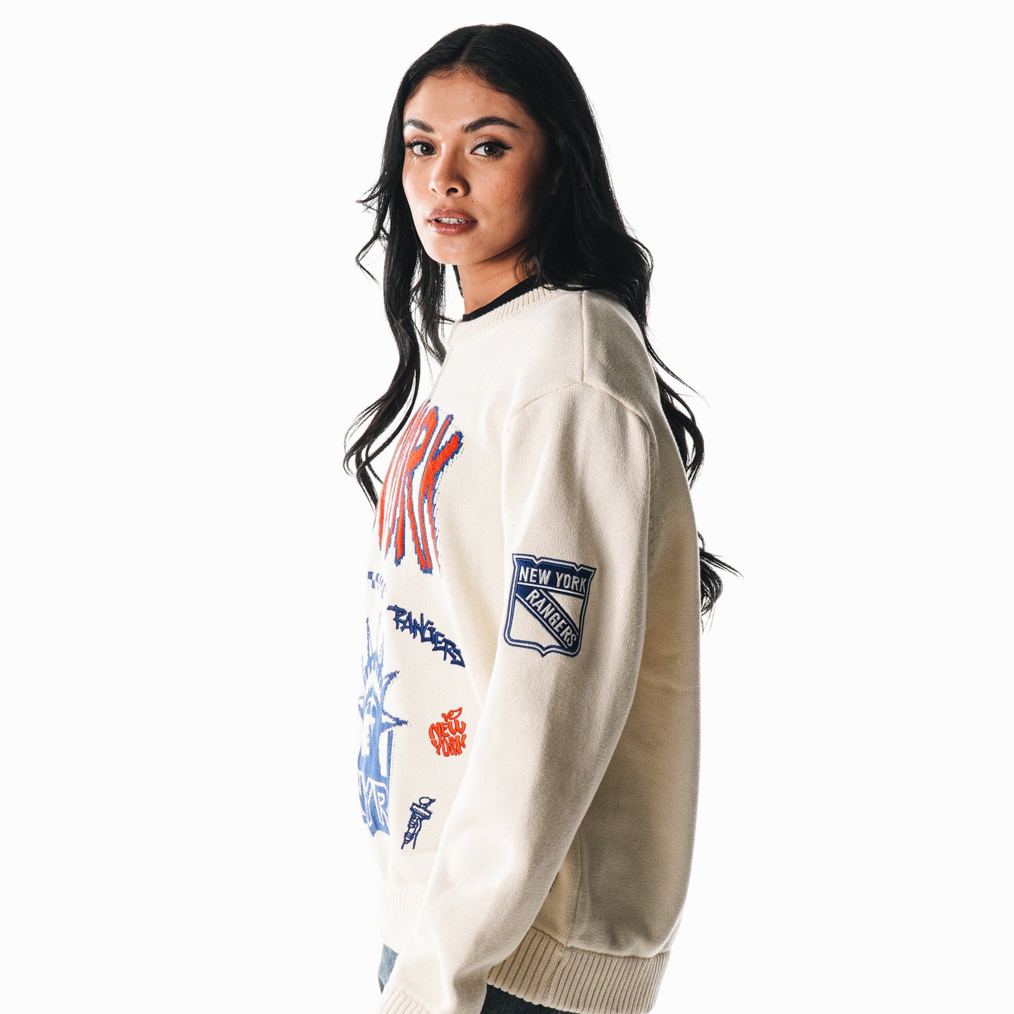 The Wild Collective Rangers Jacquard Crew Sweater is a standout piece for New York Rangers fans looking for a bold, street-style aesthetic. Featuring a textured jacquard knit design, this sweater showcases graffiti-inspired graphics, the team name, and the iconic Liberty logo. Its cozy, oversized fit makes it perfect for layering on game day or adding a statement piece to your everyday wardrobe.