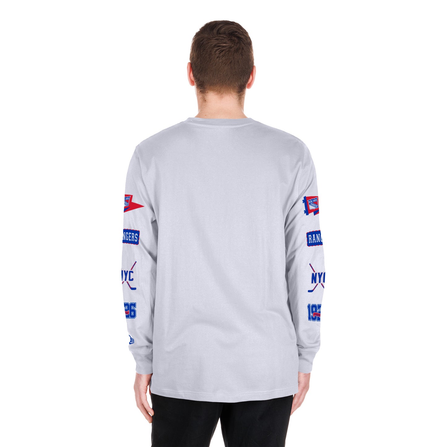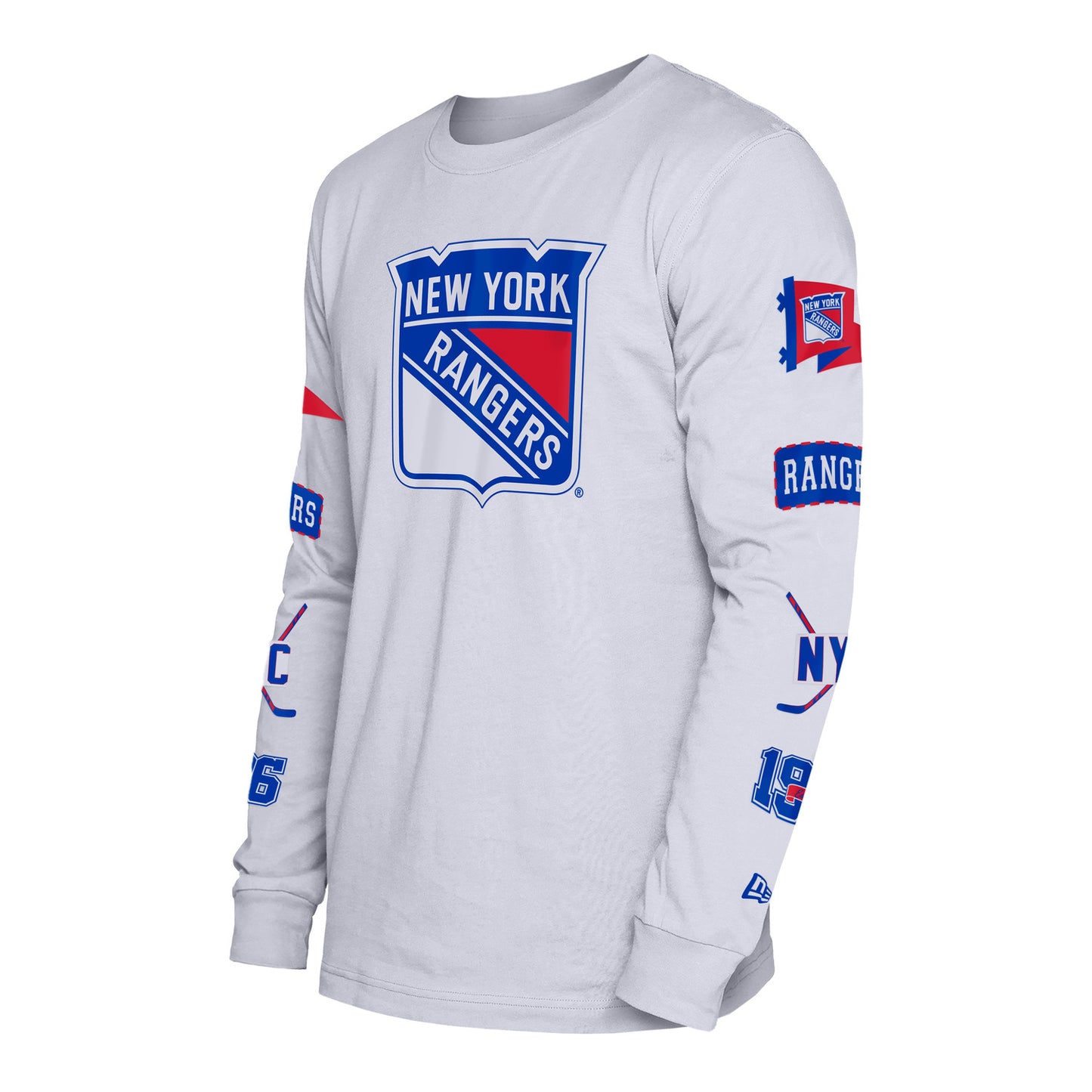 Get ready for game day in style with the New Era Rangers Game Day Logo Longsleeve Tee. Featuring a bold New York Rangers shield logo on the front and detailed sleeve graphics showcasing the team's history and spirit, this long-sleeve tee is a must-have for dedicated fans. The crisp white fabric makes the design pop, while the comfortable cotton construction ensures all-day wearability. Whether you're cheering from the stands or representing the Rangers off the ice, this tee is the perfect addition to your hockey wardrobe.