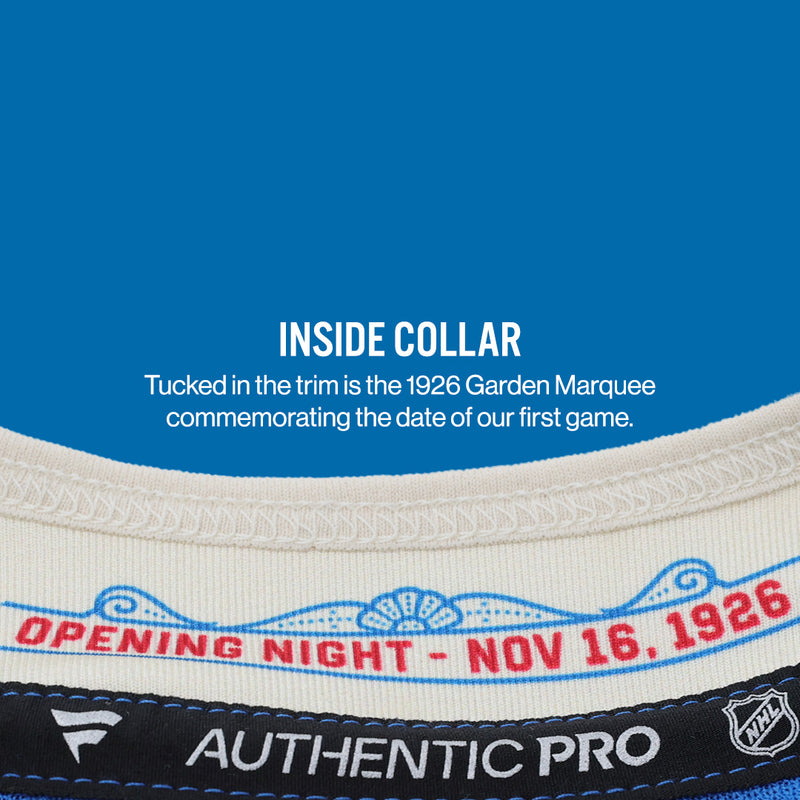 To celebrate 100 years of Rangers hockey, each jersey proudly features the Centennial patch on the left shoulder. Inspired by the team’s original 1926 crest, the commemorative design features “100” in bold red at its center. This embroidered patch comes embellished on each jersey only when purchased online or at MSG stores.