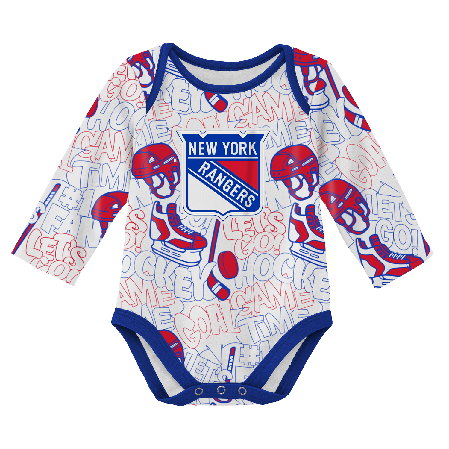 The Newborn Rangers Chase The Dream Longsleeve Onesie keeps your little fan warm and full of team spirit. Featuring soft, cozy fabric and bold Rangers graphics, it’s perfect for game days or everyday wear. Designed with snaps for easy changes, it’s as practical as it is adorable.